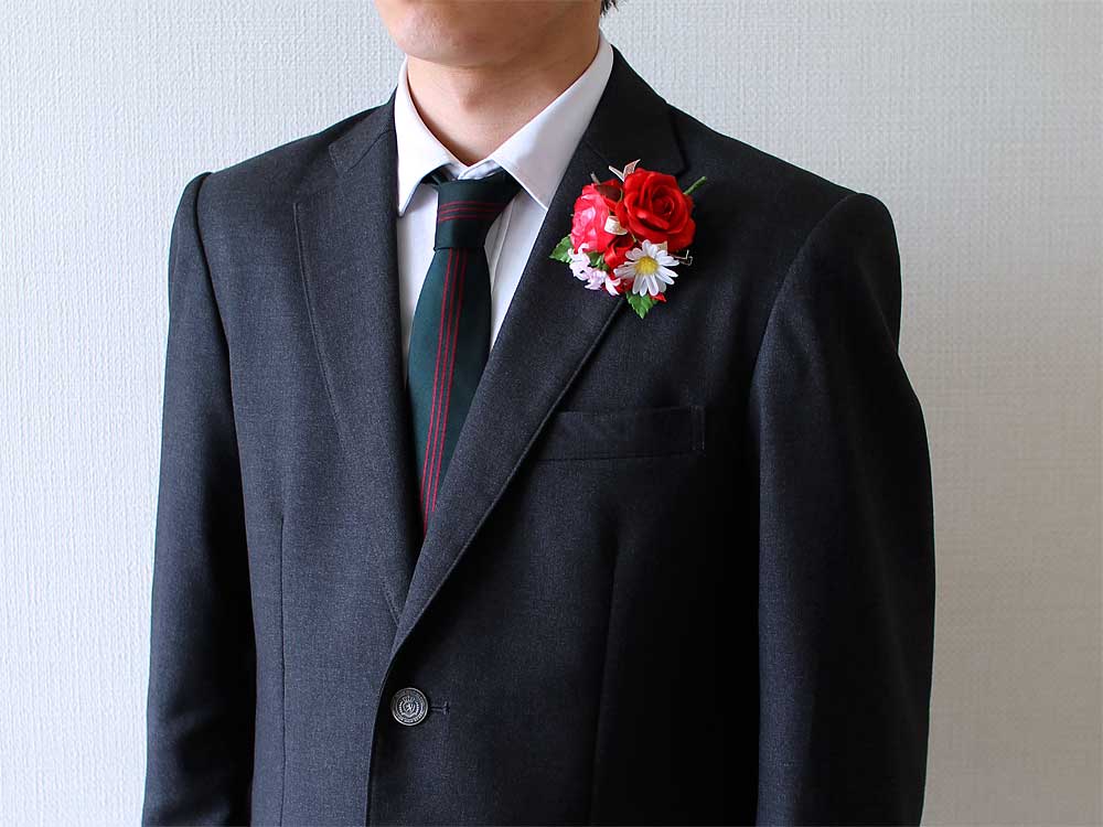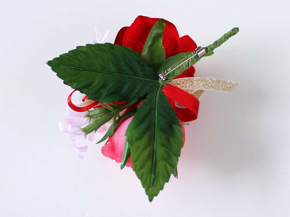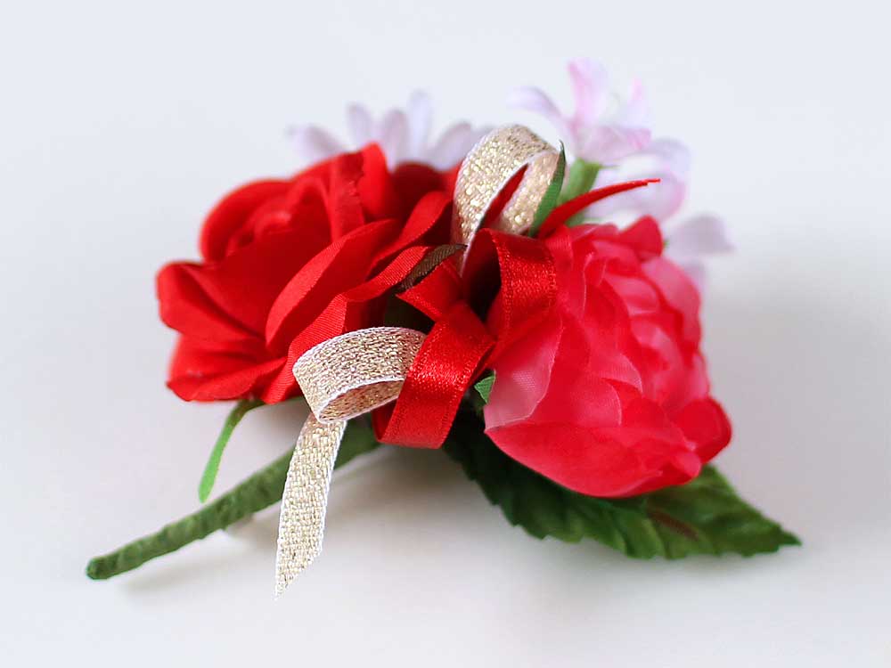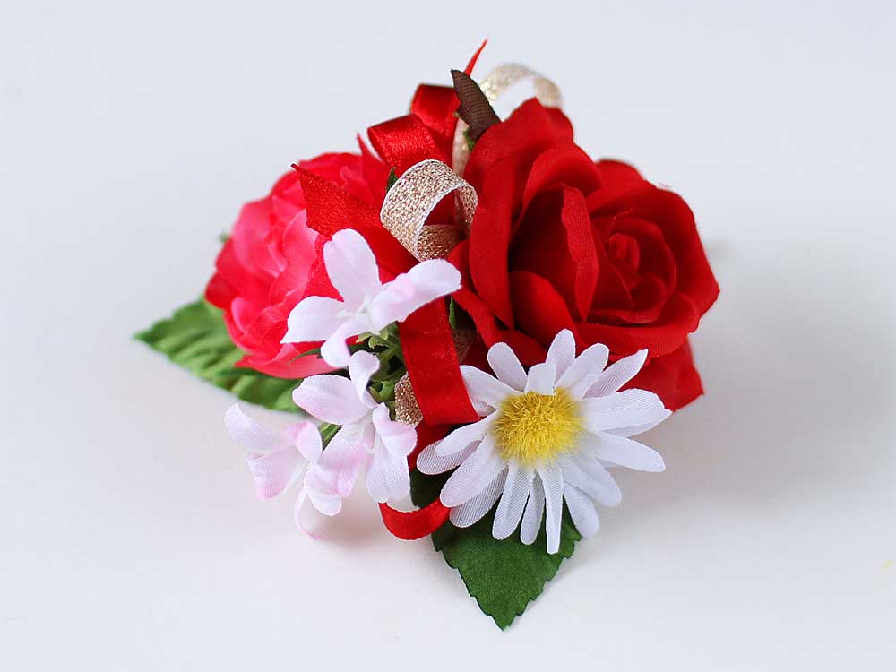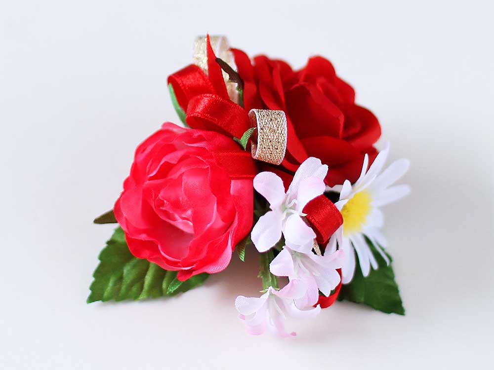 マーガレットとハニーローズ、マリーローズ、小花を合わせたブーケコサージュです。
